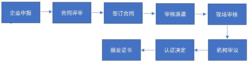 企業申報—合同評審—簽訂合同—審核派遣—現場審核—機構審議—認證決定—頒發證書